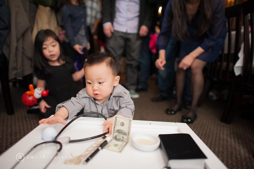 Susan hosted Devon’s 1st birthday at Novilhos Brazilian Steakhouse in Bellevue. Devon is the easiest 1 year old I’ve had to photograph to date. He smiled a lot, never cried, and was always pleasant. It was an enjoyable experience photographing him and his family. One of the fun moments was during the Doljabi, when Devon had to choose between the different items laid out for him on the table. In his case, there was a Golf Ball, a $100 bill, Stethoscope, a rope, and a book. He didn’t need any coaxing to go towards the table to pick an item. He homed in on the item he wanted and quickly crawled his way towards his target. He didn’t hesitate and chose the golf ball. Fun times!