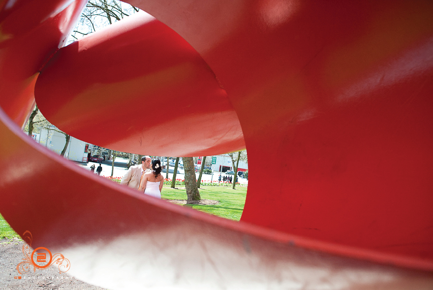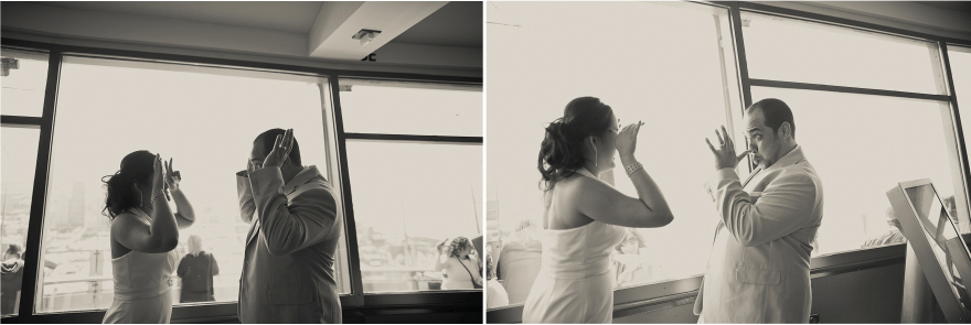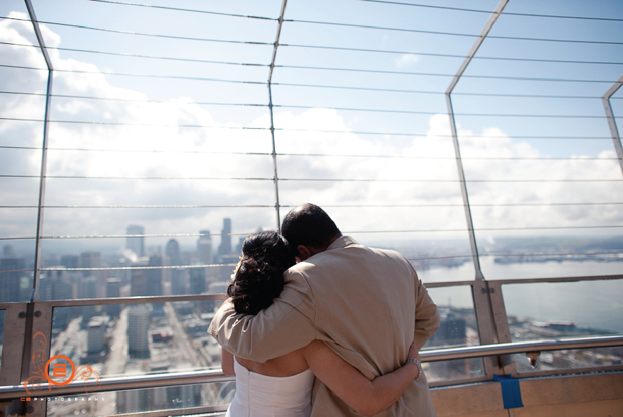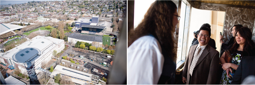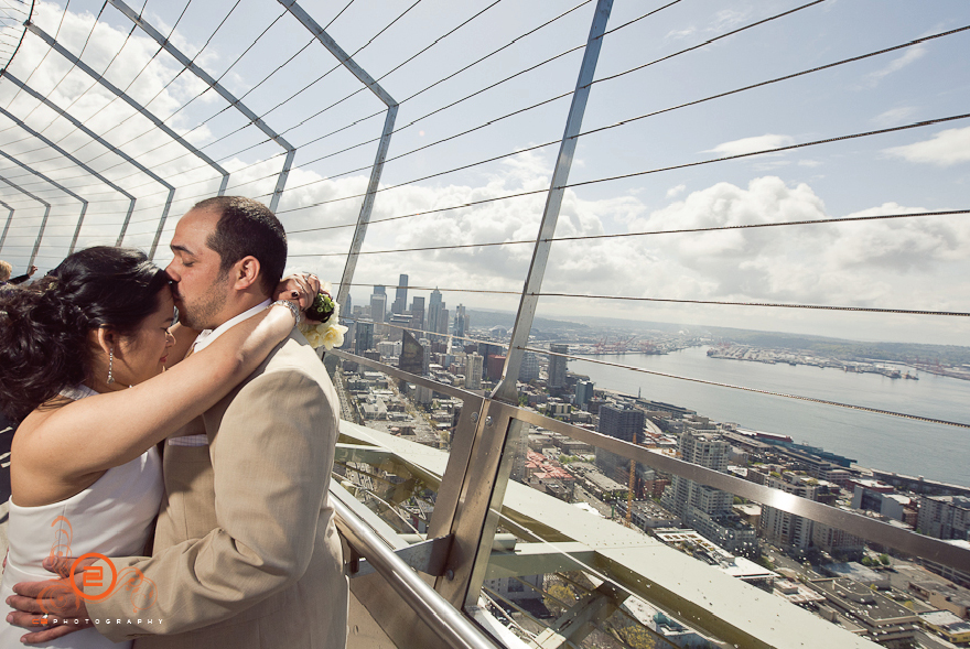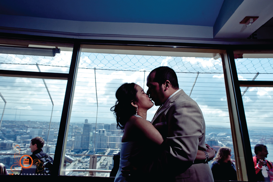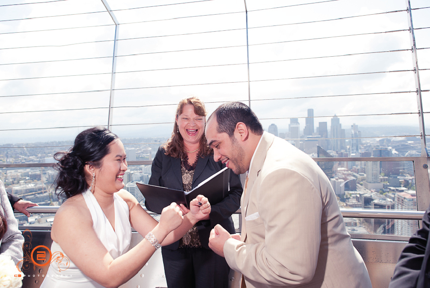 These two were very spontaneous and fun throughout the whole day. Their wedding ceremony began like a 12 round boxing bout =D. They both put up their dukes and the ceremony was on, right in the middle of the observation deck 520 feet above ground. The day couldn’t have worked out better for the two, the sun came out and gave us a beautiful view of Seattle (see for yourself!). Congrats Gicelle and Kixxo!